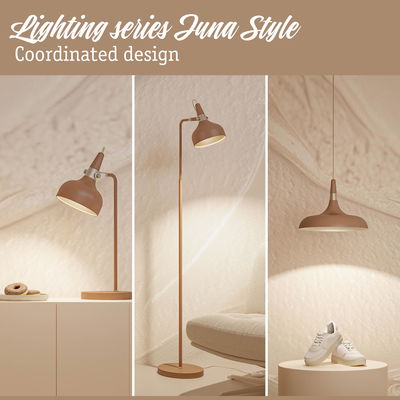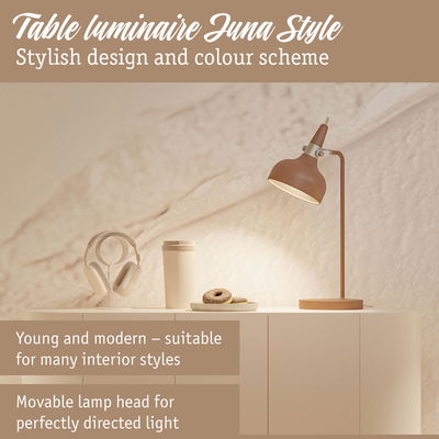 With their modern form and design language, the Juna Style luminaires create attractive lighting accents in the living area. The coordinated table, floor and pendant luminaires in the series can be harmoniously combined with each other as desired. Whether on the bedside table, as a desk luminaire or as a decorative design element on the sideboard - in its elegant nougat brown, the table luminaire is a real eye-catcher. Its high-quality workmanship not only ensures an attractive appearance, but also a long lifetime. The movable lamp head allows the light to be directed flexibly, while the textile cable ensures comfortable and safe use. Decorative head mirror lamps with an E14 base, which provide glare-free light, are particularly suitable as a recommended light source.