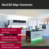 The MaxLED system can be perfectly adapted or branched around the peculiarities of a room, such as corners or steps, using connectors. The corner connector enables the strips to be laid in both interior and exterior corners.