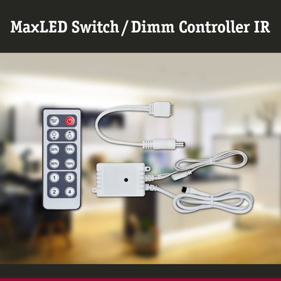 With the MaxLED Dim/Switch Controller and the supplied infra-red remote control, the uni-coloured MaxLED strips can be switched and dimmed. A line of sight is required between remote control and receiver for this purpose. The four memory spaces enable the programming of individual requirements.