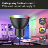 The LED reflector in Black matt with RGBW+, an output of 4,8W and 350lm emits a pleasant, uniform light. This lamp fits any standard GU10 fitting and is ideal for rail or cable systems. The lamp is compatible with Zigbee 3.0. Zigbee 3.0 is a radio transmission protocol that interlinks devices from different manufacturers. Depending on your mood, you can choose between true warm white, coloured light and various effects. Reflector lamps provide directed light in pendant luminaires, spots and spotlights. They only emit light forwards and highlight pictures, decorations or entire wall surfaces with targeted illumination. The Paulmann LED lamps with the Eye friendly label emit gentle-on-the-eyes, comfortable light. Luminaires help create eye comfort – while working, reading, or relaxing.