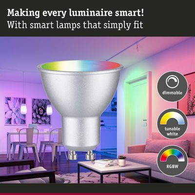 The LED reflector in Chrome matt with RGBW+, an output of 4,8W and 350lm emits a pleasant, uniform light. This lamp fits any standard GU10 fitting and is ideal for rail or cable systems. The lamp is compatible with Zigbee 3.0. Zigbee 3.0 is a radio transmission protocol that interlinks devices from different manufacturers. Depending on your mood, you can choose between true warm white, coloured light and various effects. Reflector lamps provide directed light in pendant luminaires, spots and spotlights. They only emit light forwards and highlight pictures, decorations or entire wall surfaces with targeted illumination. The Paulmann LED lamps with the Eye friendly label emit gentle-on-the-eyes, comfortable light. Luminaires help create eye comfort – while working, reading, or relaxing.