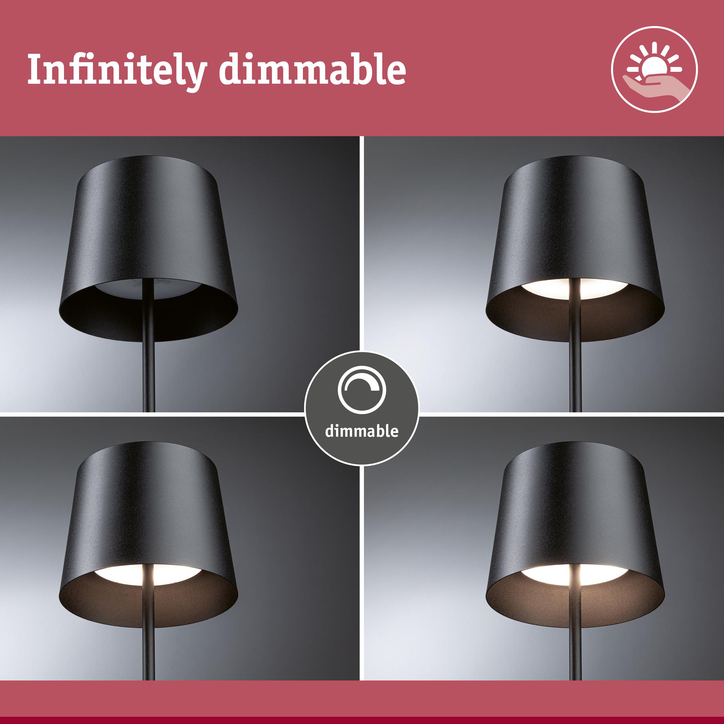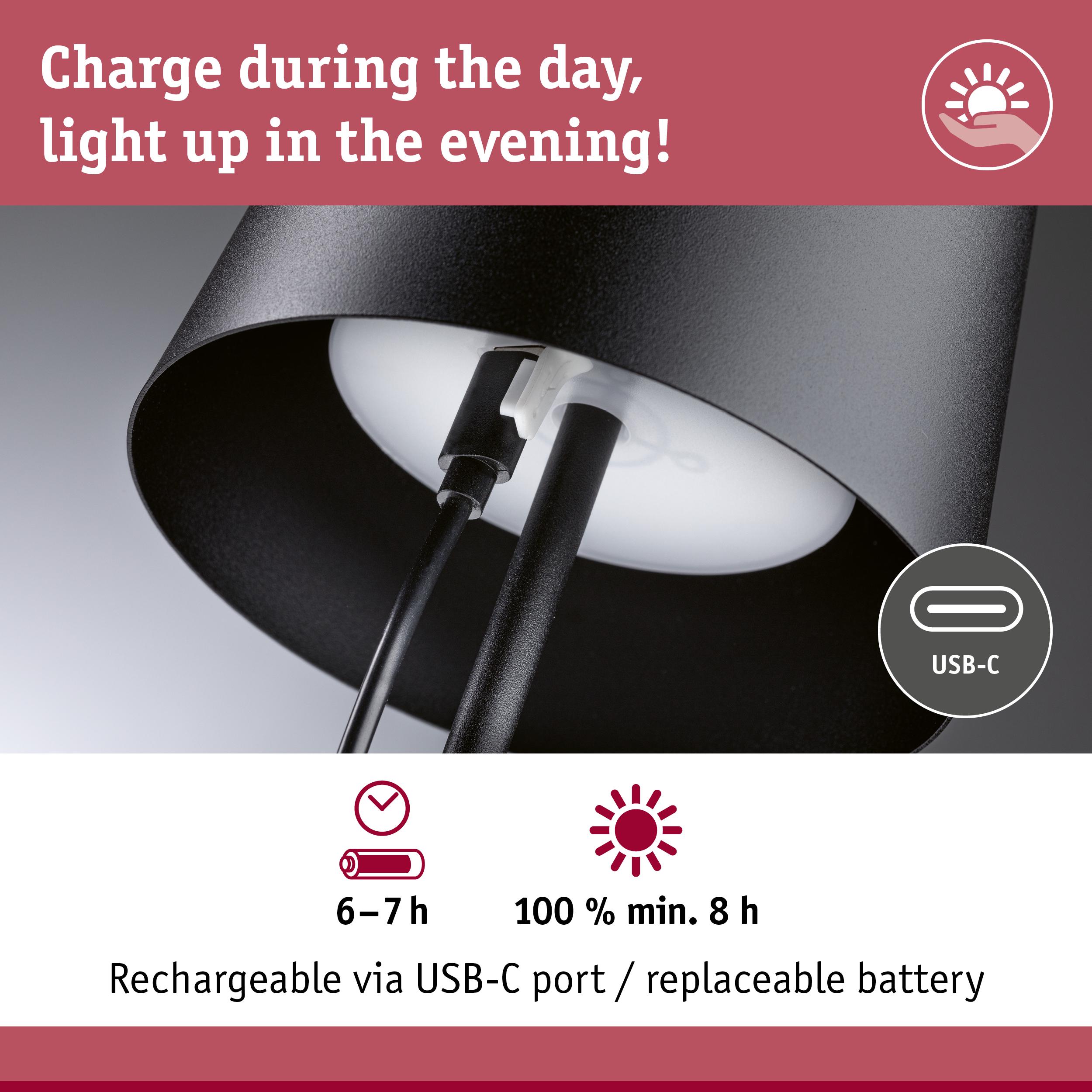 The portable battery-powered LED table luminaire Gilo with IP44 in Black matt is handy and compact, thanks to its dimensions of 105 x 350 mm. It does not need a power connection, allowing it to be used both indoors and outdoors. Whether it’s out camping, on the patio or balcony, in a restaurant or the living room – the battery-powered table luminaire can be used anywhere. Its reduced, timeless design makes it universal and flexible. The luminaire creates a warm white lighting mood and features a high-quality finish and durable materials, ensuring a long service life. The fast charging time of 5–6 hours provides a long illumination time of up to 10 hours at full brightness (100%). The battery-powered table luminaire can be charged via the USB-C connection and features a continuous touch dimming function.