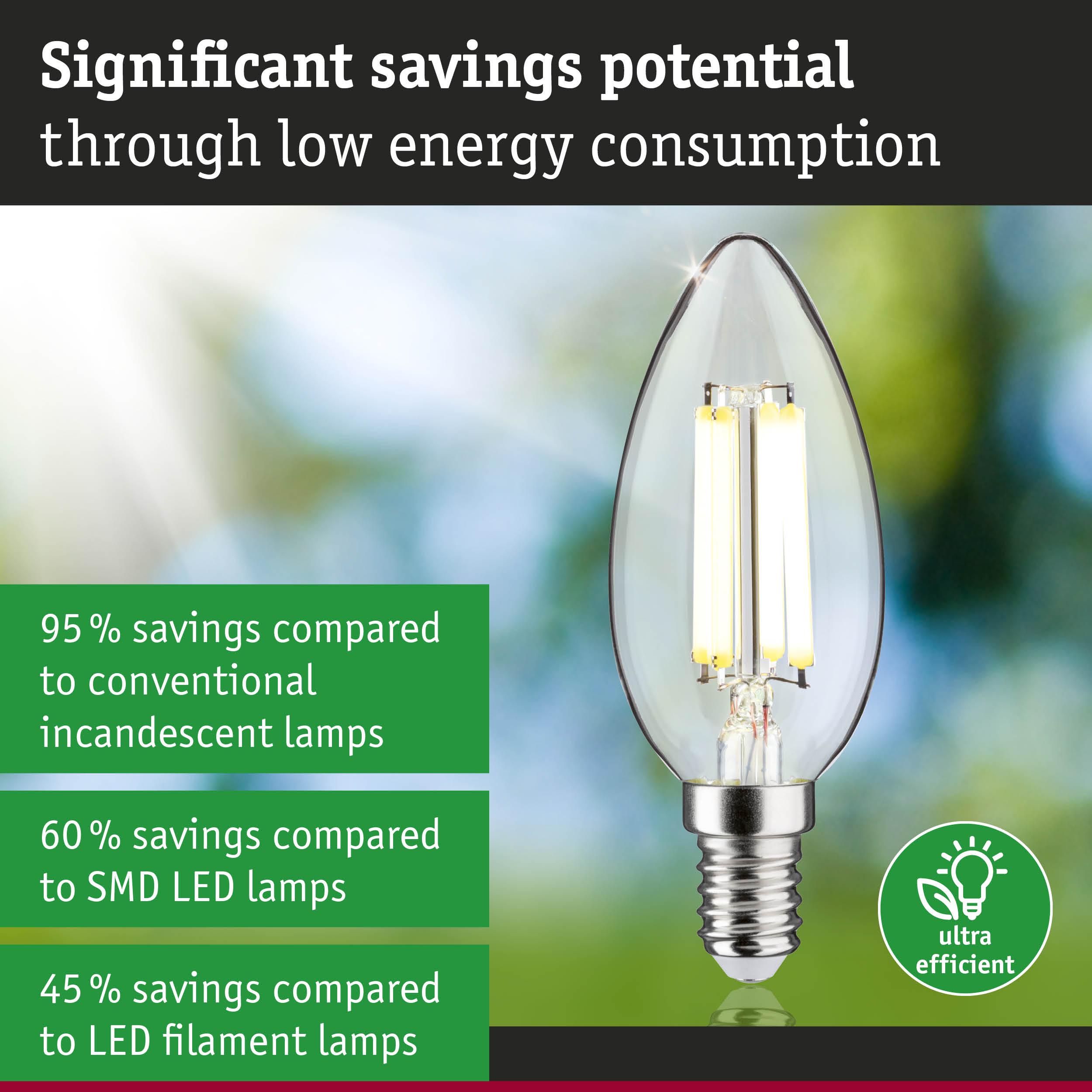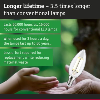 The ultra-efficient Eco-Line lamps combine innovation with sustainability. Thanks to the 60% lower energy consumption and the significantly longer service life compared to standard LED lamps, these lamps can significantly reduce energy costs and protect the environment. The candle-shaped lamp with 4000K, an output of 2.5W and 525lm creates a pleasant uniform light with no green cast. Thanks to their slim design, candle lamps are particularly suitable for use in chandeliers, as well as in wall and ceiling luminaires. Their pleasant light creates a feel-good atmosphere in your living space. The lamp fits any standard E14 fitting.