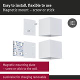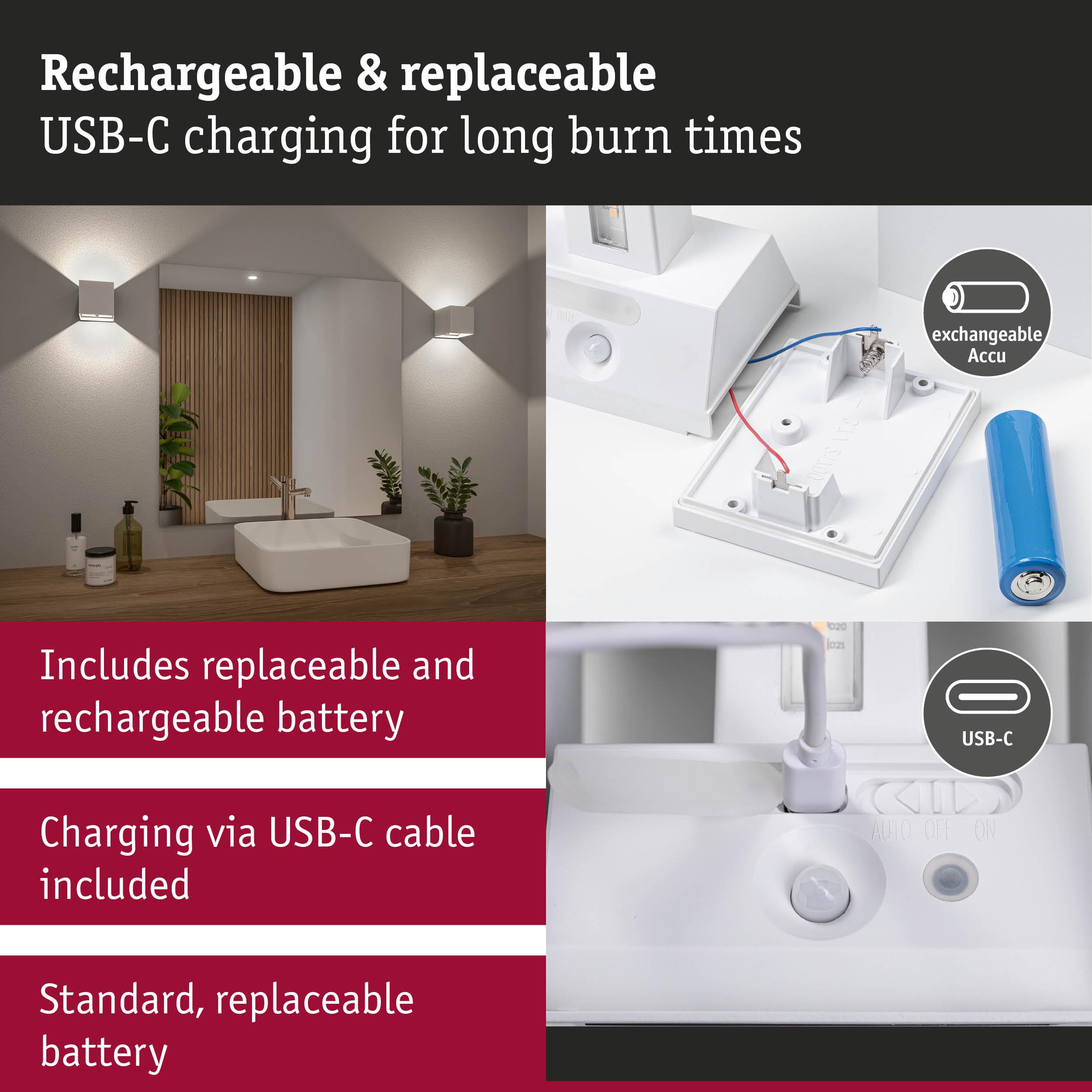 The angular rechargeable Nyara wall luminaire in White with integrated motion sensor is a perfect choice where a functional auxiliary or orientation light is needed. As there is no need for a power outlet, it can be used in the living room, hallway, and – thanks to its IP44 protection – even in the bathroom, on the balcony, or on an external wall. The luminaire offers three setting options: On, Off, and Auto. Switched on, the luminaire continuously emits warm white light at 40% brightness. In Auto mode, the dusk-controlled motion sensor is activated, and the light automatically switches to 100% brightness for maximum comfort and security. Light time in Auto mode is at around 8 hours, and 23 hours in On mode. The luminaire deactivates after 30 seconds if no motion is detected or ambient brightness surpasses 30 lux. The included USB-C charging cable guarantees quick charging times of the rechargeable battery in 6 hours. As an installation aid, the magnetic backplate can be glued or bolted to the wall. It ensures that the luminaire is quickly and easily removed for charging.