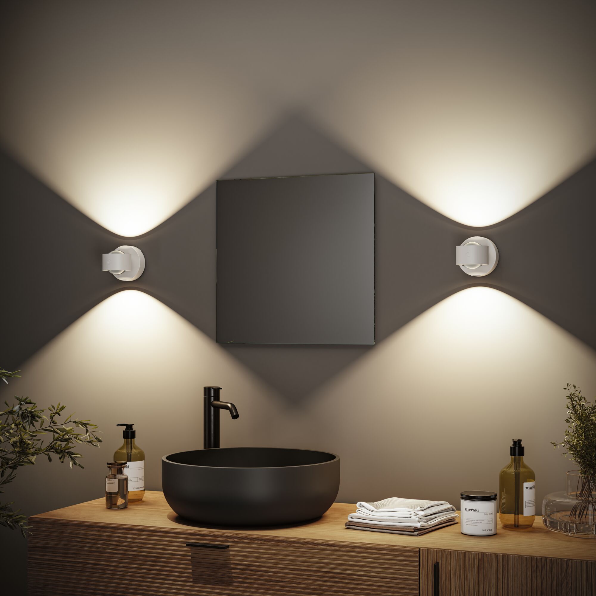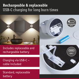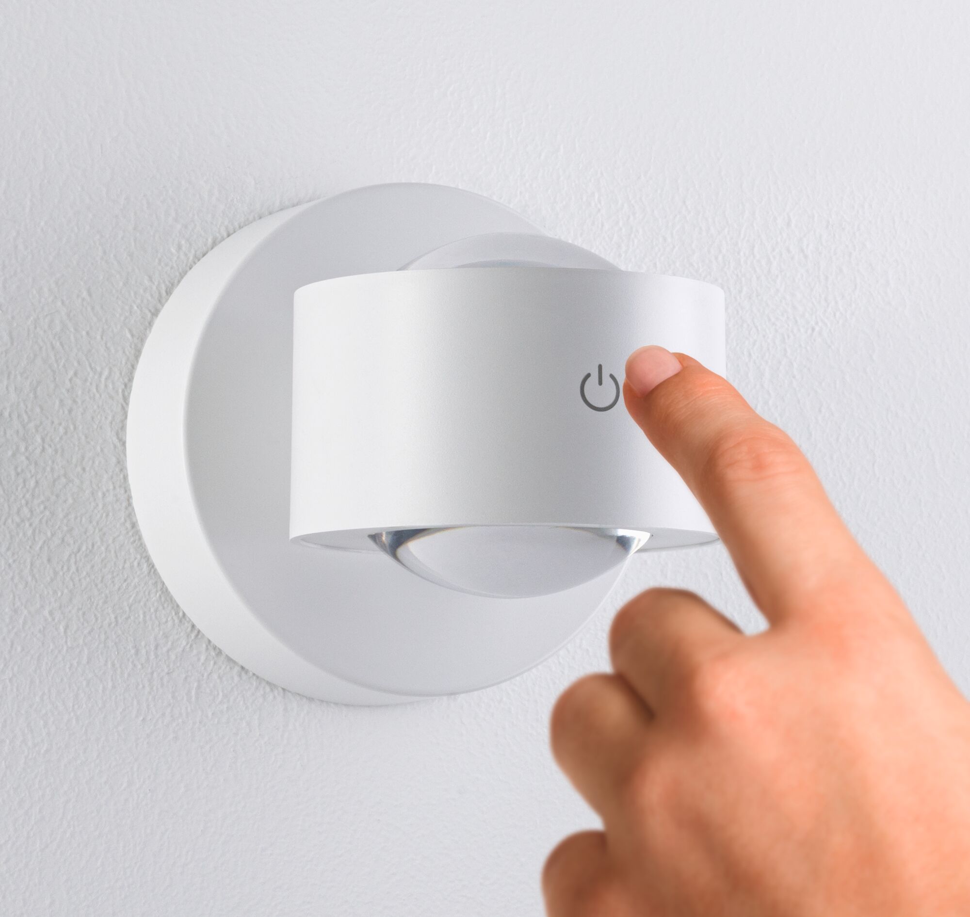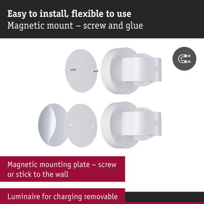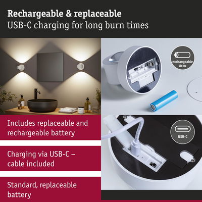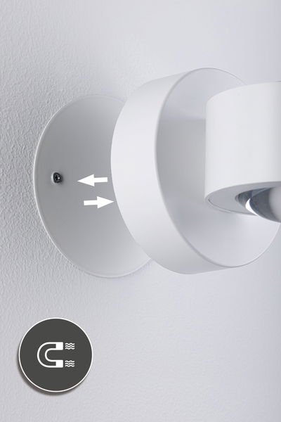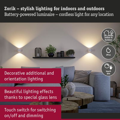 The high-quality glass lens of the rechargeable Zorik wall luminaire in White creates a particularly beautiful light effect on walls. As there is no need for a power outlet, it can be used with plenty of flexibility as a decorative auxiliary or orientation light in the living room, hallway, and – thanks to its IP44 protection – even in the bathroom, on the balcony, or on an external wall. The pleasant colour temperature of 2700K ensures an attractive warm white light. Switching the light on and off, as well as continuous dimming are made easy via the integrated touch switch. A memory function saves the most recently selected setting until the next time it is switched on. At maximum brightness, the luminaire achieves an operating time of 13 hours, and as much as 20 hours when dimmed. The included USB-C charging cable guarantees quick charging times of the rechargeable battery, which is easily replaced. As an installation aid, the magnetic backplate can be glued or bolted to the wall. It ensures that the luminaire is quickly and easily removed for charging.