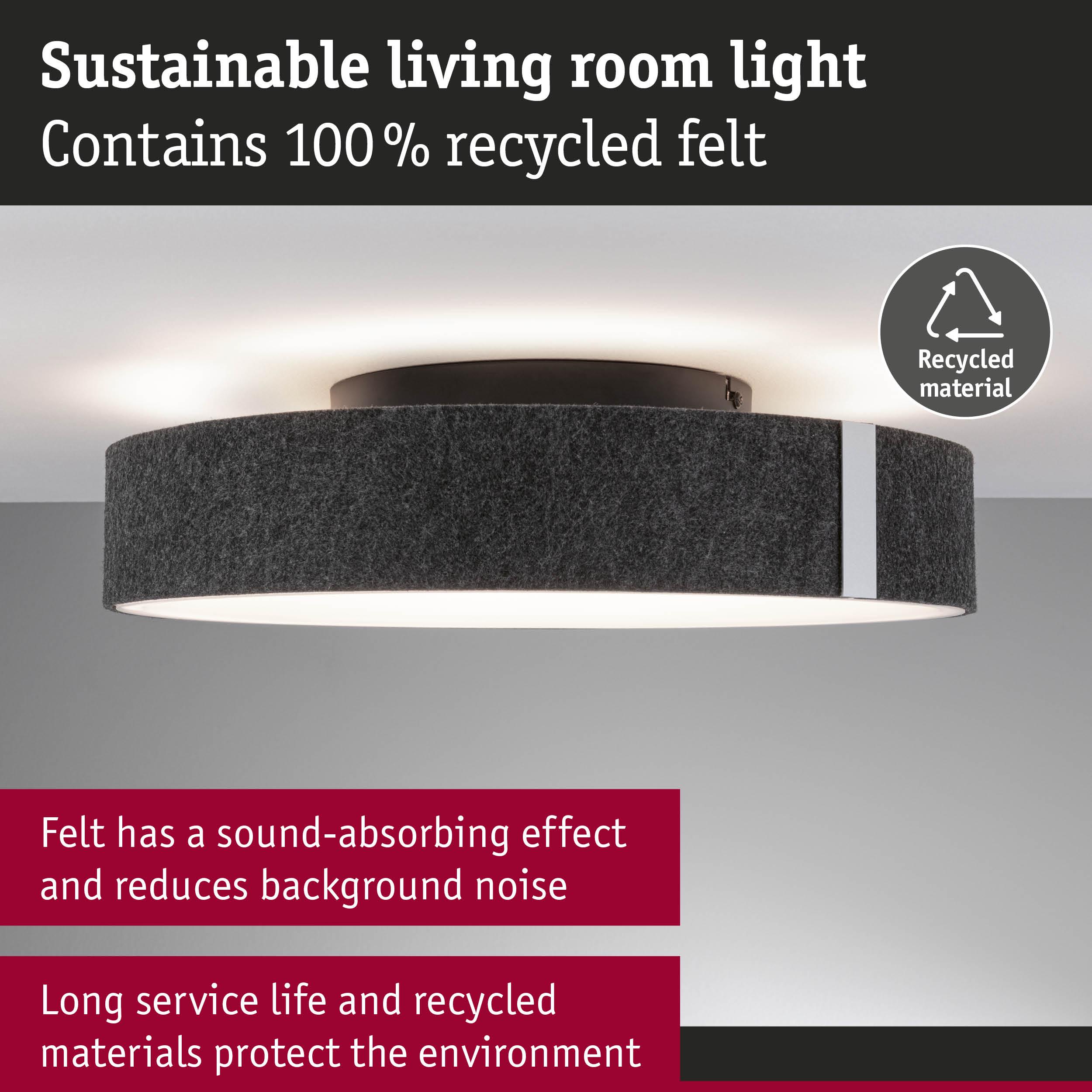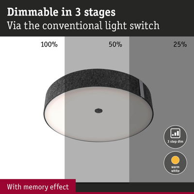 The LED ceiling luminaire Malika, made of felt in Anthracite with 2300lm, not only stands out for its simple modern design, but also creates a pleasant atmosphere while reducing disruptive background noise. What’s more, it’s made of sustainable, recycled material. Backlight technology conjures a special feel-good atmosphere and gives the ceiling luminaire an almost floating luminous appearance. The warm colour temperature creates a cosy ambiance for relaxing moments at home. The luminaire can be dimmed in 3 steps using a standard wall switch. Thanks to the memory function, the luminaire always remembers your preferred settings.