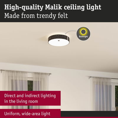 The LED ceiling luminaire Malika, made of felt in Anthracite with 2300lm, not only stands out for its simple modern design, but also creates a pleasant atmosphere while reducing disruptive background noise. What’s more, it’s made of sustainable, recycled material. Backlight technology conjures a special feel-good atmosphere and gives the ceiling luminaire an almost floating luminous appearance. The warm colour temperature creates a cosy ambiance for relaxing moments at home. The luminaire can be dimmed in 3 steps using a standard wall switch. Thanks to the memory function, the luminaire always remembers your preferred settings.