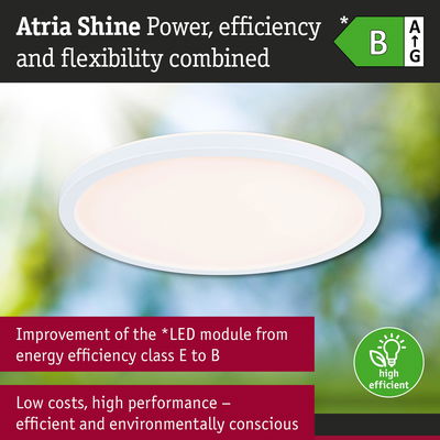 The round Atria Shine panel luminaire in White is a true all-rounder, offering high energy efficiency and a choice of light colours! Its energy efficiency was improved (Class E to Class B), making the new Atria Shine panel luminaire an innovative and future-proof lighting solution. This significantly reduced consumption is not only good for the environment, but for your wallet too, thanks to lower energy costs. Before installation, it’s possible to choose between three light colours using the White Select switch: warm white (3000K), neutral white (4000K) or daylight white (6500K). Whether it’s for a cosy living area, functional kitchen lighting or brightly lit workspace: you can achieve the perfect lighting for every room. The Atria Shine panel luminaire offers an impressive brightness of 14,8W, making it a great choice for applications where plenty of light is needed. The high-effect backlight technology adds an almost floating aspect to the luminaire’s appearance. Its simple design pairs well with individual interior styles and it can even be used in the bathroom, thanks to IP44 protection. The easy-to-use twist lock and quick clip ensure an uncomplicated installation on the wall or ceiling..