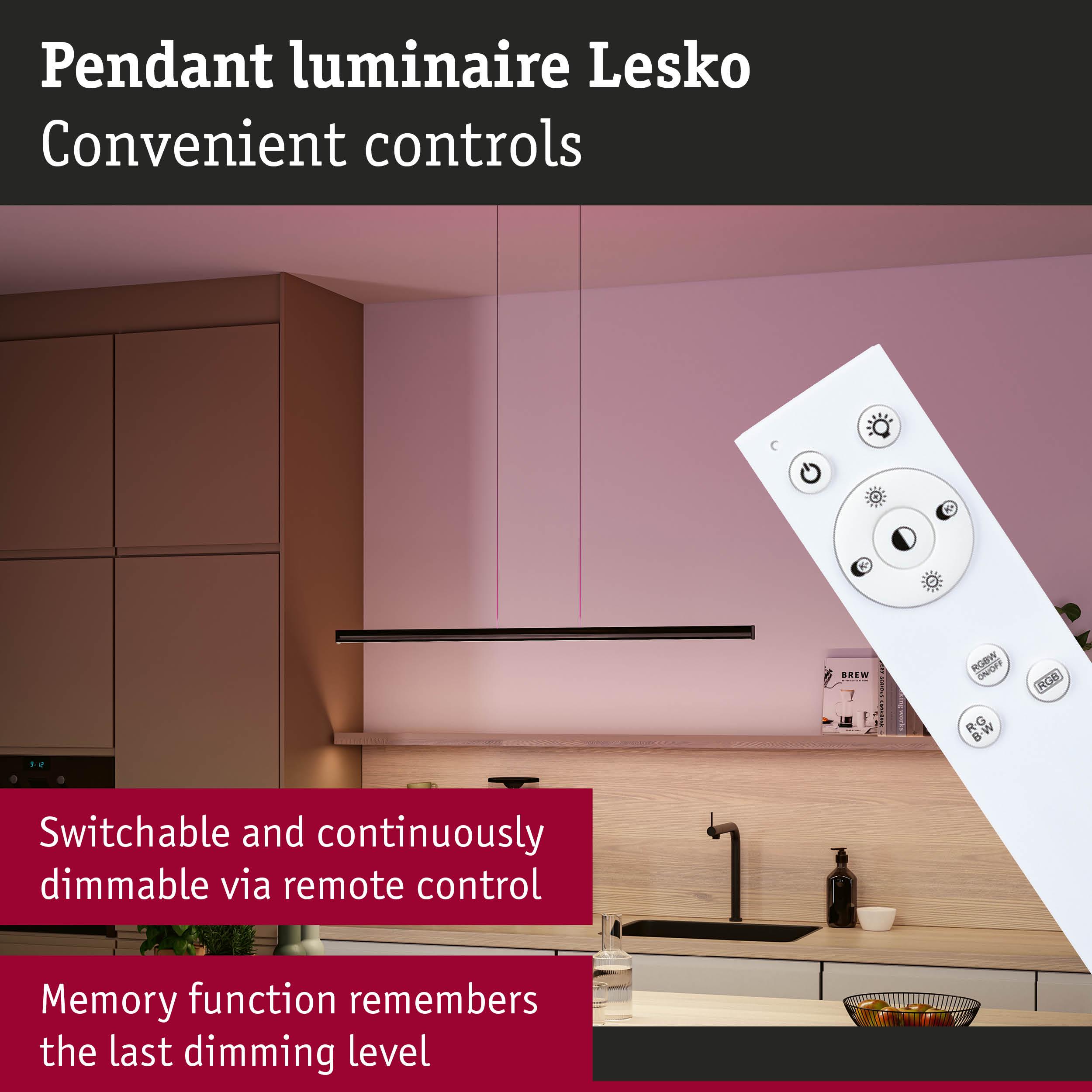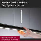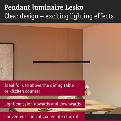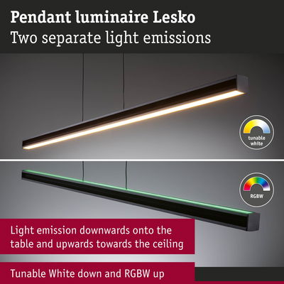 The Lesko pendant luminaire is a great choice for illuminating your dining table, kitchen countertops, or your home office. The separately controlled light emission upward or downward ensures maximum flexibility when creating your perfect light ambience. The upward light emission can be set to permanently shine in just one colour, or to create multicoloured light effects. In addition to eye-catching lighting scenarios with colour, you could also choose a simple warm white light (3000K) for an inviting ambience. The intelligent Tunable White light control allows the stepless dimming or adjustment of the light colour emitted downward – from relaxing warm white to daylight white work light (2700 - 6500K). The integrated memory function stores the most recently selected setting until the luminaire is switched on again. The luminaire comes with a remote control for the separate control of the two light emissions. The minimalist design of the pendant luminaire in Black matt will seamlessly merge with a variety of interior styles. The pendant’s elevation is easily adjustable with the “Easy Up and Down” principle without a tool by simply adjusting the length of the slimline cable.