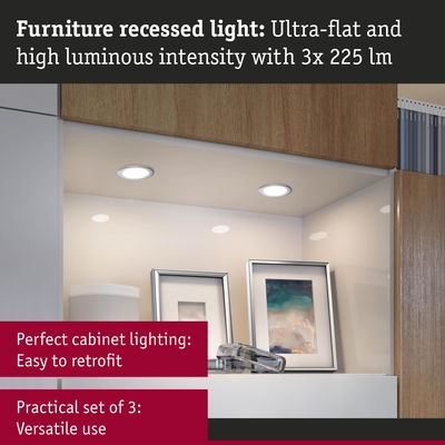 This 3-piece set of recessed furniture luminaires in Chrome with 3000K is the perfect upgrade for your furniture. The luminaires are suitable for installation openings of 54 mm and add visual accents to any room. They not only stand out for their attractive design, but also their luminous intensity. These recessed furniture luminaires offer perfect illumination, creating a pleasant atmosphere. Whether it’s in the living room, bedroom or kitchen – the recessed furniture luminaires are extremely versatile and add a special touch to any room. Especially as cabinet lighting, they are easily retrofittable and ensure perfect illumination of the cabinet interior.