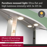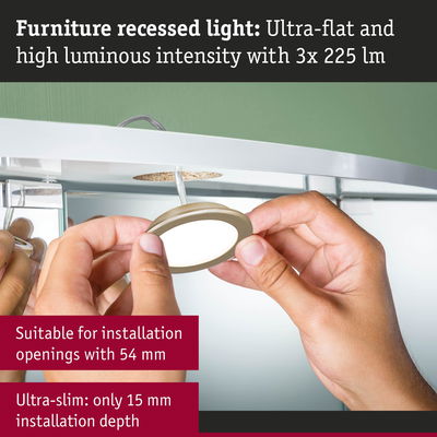 This 3-piece set of recessed furniture luminaires in Gold matt with 3000K is the perfect upgrade for your furniture. The luminaires are suitable for installation openings of 54 mm and add visual accents to any room. They not only stand out for their attractive design, but also their luminous intensity. These recessed furniture luminaires offer perfect illumination, creating a pleasant atmosphere. Whether it’s in the living room, bedroom or kitchen – the recessed furniture luminaires are extremely versatile and add a special touch to any room. Especially as cabinet lighting, they are easily retrofittable and ensure perfect illumination of the cabinet interior.