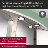 This 3-piece set of recessed furniture luminaires in Black matt with 4000K is the perfect upgrade for your furniture. The luminaires are suitable for installation openings of 54 mm and add visual accents to any room. They not only stand out for their attractive design, but also their luminous intensity. These recessed furniture luminaires offer perfect illumination, creating a pleasant atmosphere. Whether it’s in the living room, bedroom or kitchen – the recessed furniture luminaires are extremely versatile and add a special touch to any room. Especially as cabinet lighting, they are easily retrofittable and ensure perfect illumination of the cabinet interior.