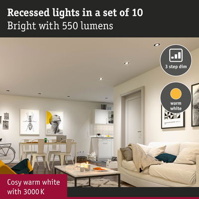Simplistic design in a pack of 10: the individually swivelling LED recessed spots in timeless white direct light exactly where you need it. The integrated three-stage dimming function offers three dimming levels with multiple pushes of a regular commercial light switch.