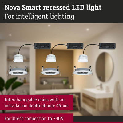 The smart Nova Coin recessed luminaire set in Turned aluminium with colour-change function creates an individual living atmosphere in every room. Included in delivery are three replaceable LED lamps, including high-quality aluminium mounting rings. Exceptionally high IP44 protection makes the luminaires ideal for use in wet rooms and protects them against splash water. With an output of 3x6 watts and Zigbee 3.0 controls, the luminaire provides an efficient and innovative lighting solution. Zigbee 3.0 is a radio transmission protocol that interlinks devices from different manufacturers. The luminaires can be controlled individually or in groups via app, remote control, or voice command. From cosy, warm gold light (2200K) to functional daylight white (6500K): the tunable white function allows you to continuously adjust the light colour to your preferences. The continuous dimming function lets you adjust the brightness depending on your needs: a bright work light and feel-good mood lighting in one! The smart recessed luminaires can also be simply and conveniently switched on and off using a conventional light switch. When doing so, the integrated memory function stores the most recently used setting for maximum convenience. Installation is particularly simple and efficient, thanks to the interlinkable and replaceable coins, the low installation depth of just 45 mm and the 230V direct connection.