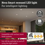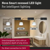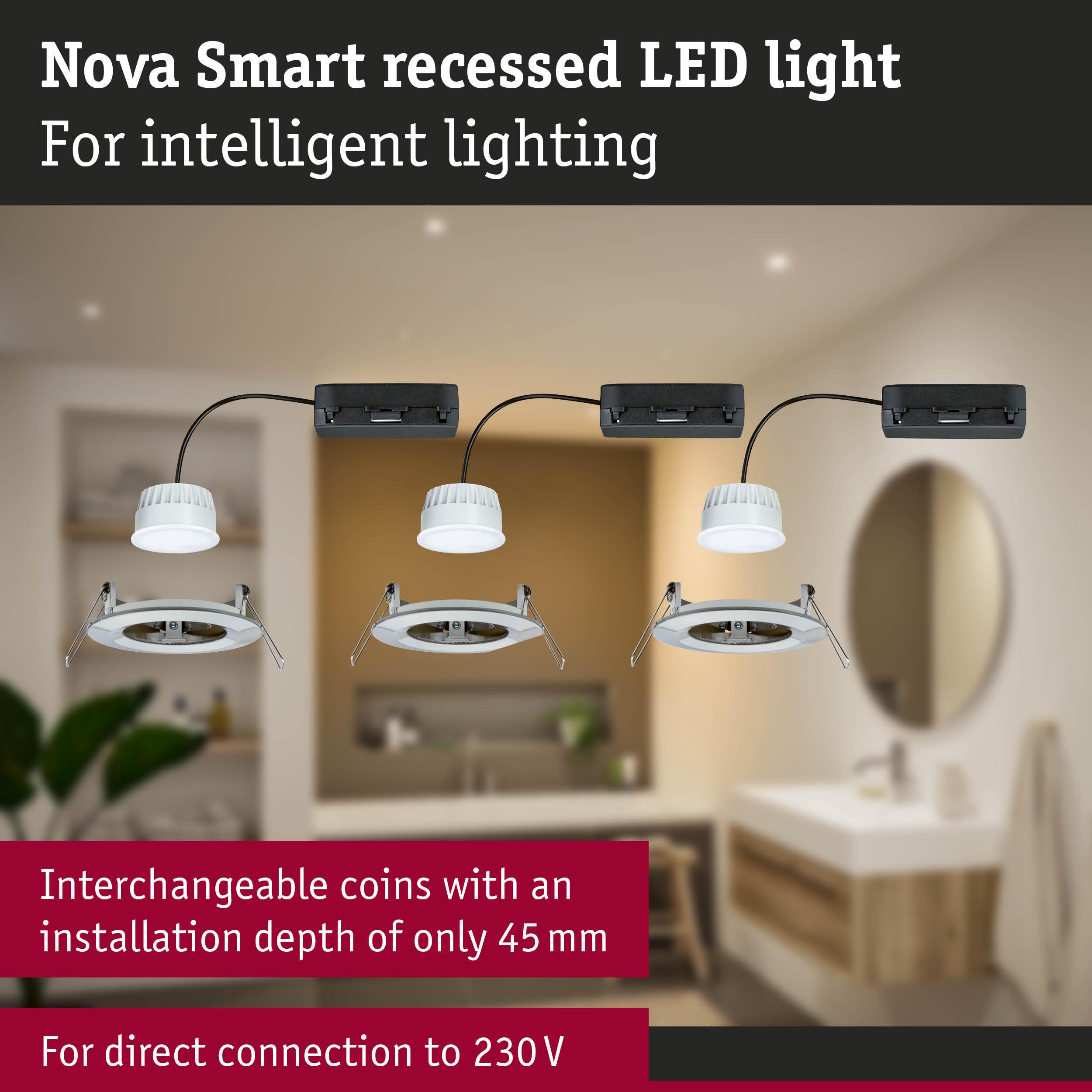 The smart Nova Coin recessed luminaire set in Matt white with colour-change function creates an individual living atmosphere in every room. Included in delivery is one replaceable LED lamps, including a high-quality aluminium mounting ring. Exceptionally high IP44 protection makes the luminaires ideal for use in wet rooms and protects them against splash water. With an output of 6 watts and Zigbee 3.0 controls, the luminaire provides an efficient and innovative lighting solution. Zigbee 3.0 is a radio transmission protocol that interlinks devices from different manufacturers. The luminaires can be controlled individually or in groups via app, remote control, or voice command. From cosy, warm gold light (2200K) to functional daylight white (6500K): the tunable white function allows you to continuously adjust the light colour to your preferences. The continuous dimming function lets you adjust the brightness depending on your needs: a bright work light and feel-good mood lighting in one! The smart recessed luminaires can also be simply and conveniently switched on and off using a conventional light switch. When doing so, the integrated memory function stores the most recently used setting for maximum convenience. Installation is particularly simple and efficient, thanks to the interlinkable and replaceable coins, the low installation depth of just 45 mm and the 230V direct connection.