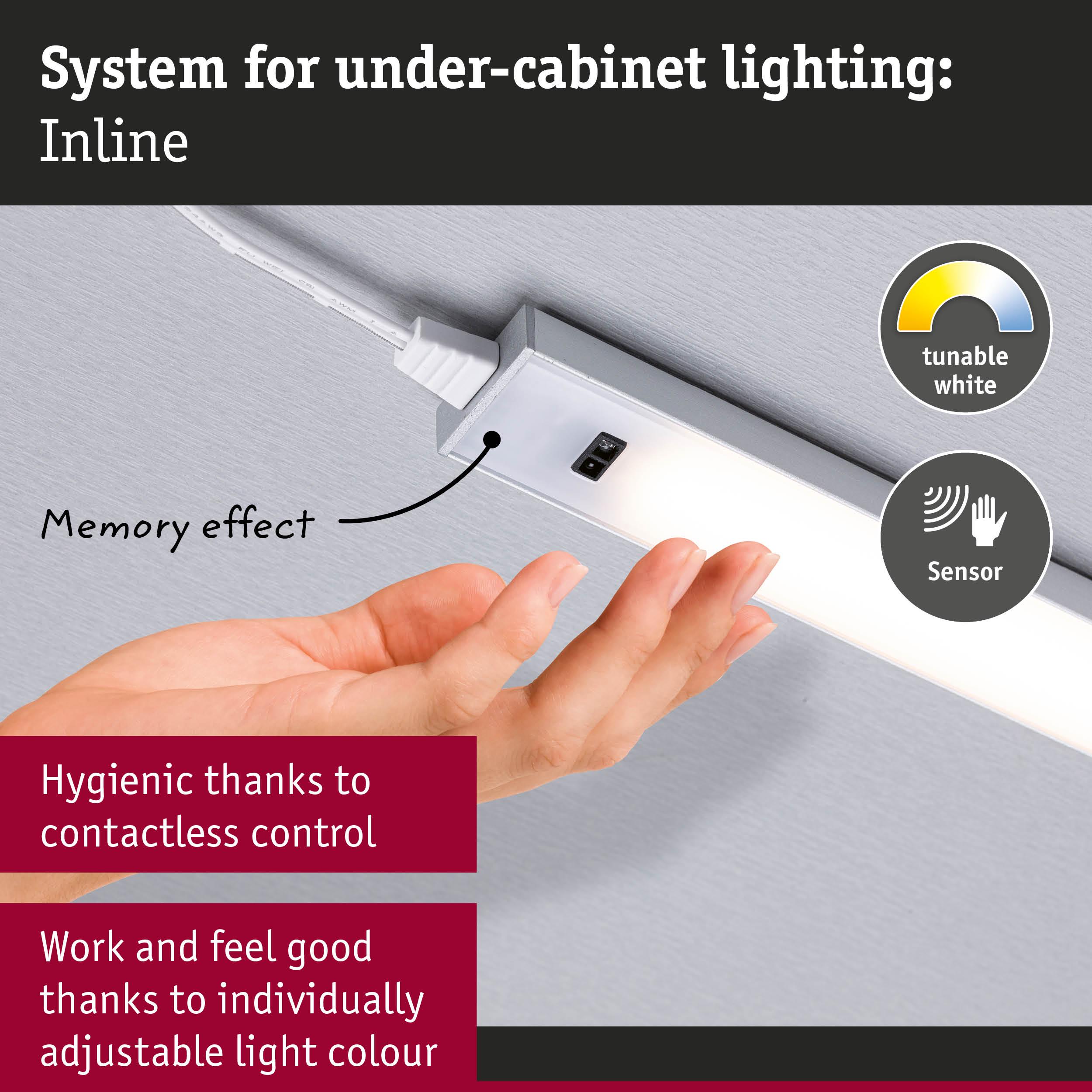 This expansion set, consisting of two Inline furniture luminaires in subtle Matt white with a length of 550x26mm, is the perfect addition to the Inline starter set. The luminaires are an elegant solution for the optimal illumination of kitchen work surfaces. The luminaires are made from easy-to-clean, high-quality materials, so they can be effortlessly kept clean. Thanks to the PIR sensor, the luminaires can be switched on and off contactlessly, helping to maintain good kitchen hygiene. The light can be individually adjusted to your personal preferences using the tunable white function – whether it’s for focused work or getting comfortable in a cosy atmosphere. A special highlight is the memory effect, which saves the selected light colour.