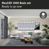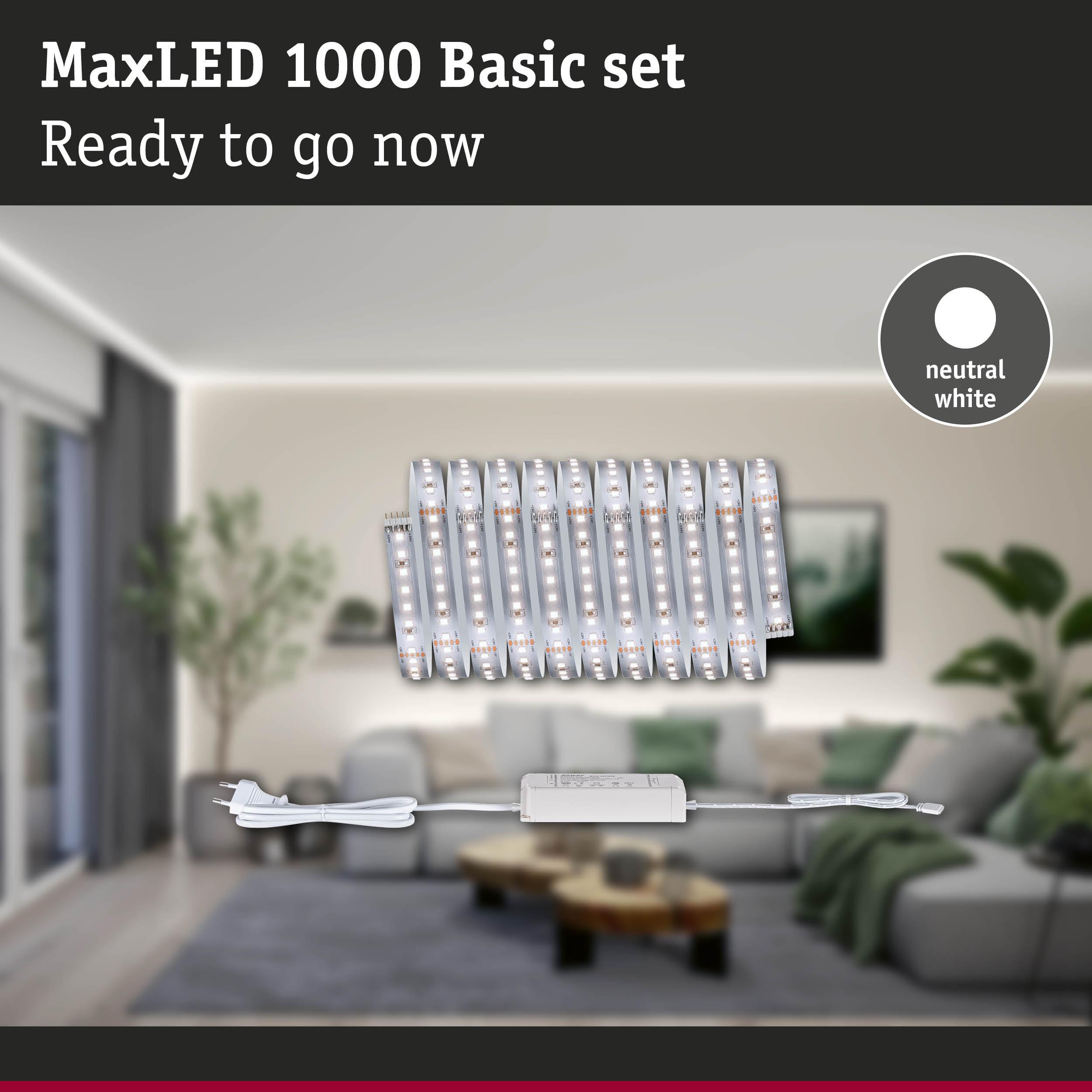 The neutral white MaxLED 1000 basic set is always a great choice for modern, energy-efficient lighting solutions. The LED strip offers 40% less energy consumption than traditional luminaires at the same light output. The strip is a great choice for profile applications. Its 22 W and 1100lm/m output is so powerful that it can be used for room illumination. The 4000K colour temperature ensures an attractive and glare-free light – perfect for living rooms, kitchens, or bedrooms. Additionally, the brightness is dimmable, creating the right light ambience for any occasion. The strip can easily be shortened with a pair of scissors to adapt its length to specific space requirements. The design options are virtually endless, as the strip is easily attached to furniture, shelves, or walls. The basic set contains not only the strip but also a suitable ballast. If required it can be extended by a control unit with remote control.