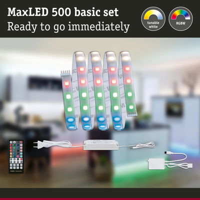 MaxLED strips are so powerful that they can easily be used as room lighting. They are real highlights especially in profiles. Thanks to the atmospheric colour change function they create an individual living ambience – where anything is possible, ranging from uni-coloured continuous lighting to multi-coloured light effects. A diode in white (W) additionally provides for a warm white light. As a result there is no need to mix white shade from the red, green and blue (RGB) colours. In addition to the strip, the basic set contains a suitable ballast and a control unit with remote control. Where required, it can be extended with additional strips, connectors and control units with remote control. When planning, please keep in mind the maximum length specified for the basic set, which must not be exceeded.