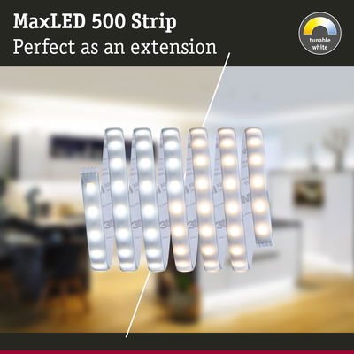 With a length of 2,5m, the MaxLED 500 strip is so powerful that it can be easily used for room lighting. They are real highlights especially in profiles. Thanks to the intelligent Tunable White light control, the light colour of the strips can be varied individually – ranging from daylight white work light to warm white relaxation light. The individual strips allow you to extend your basic set as required During planning, please note the maximum length as given below, as this must not be exceeded.