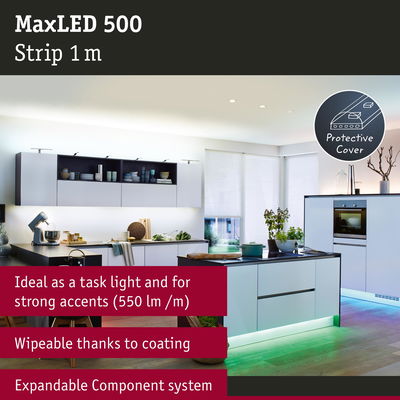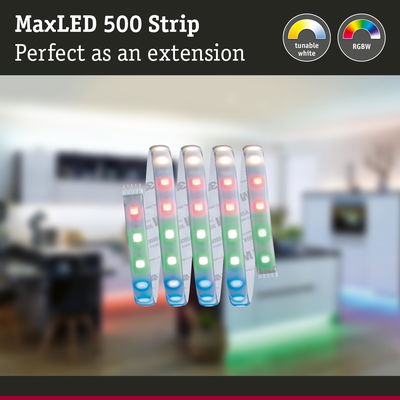 MaxLED strips are so powerful that they can easily be used as room lighting. They are real highlights especially in profiles. Thanks to the atmospheric colour change function they create an individual living ambience – where anything is possible, ranging from uni-coloured continuous lighting to multi-coloured light effects. A diode in white (W) additionally provides for a warm white light. As a result there is no need to mix white shade from the red, green and blue (RGB) colours. Where required, you can extend your basic set with individual strips. When planning, please keep in mind the maximum length specified for the basic set, which must not be exceeded.