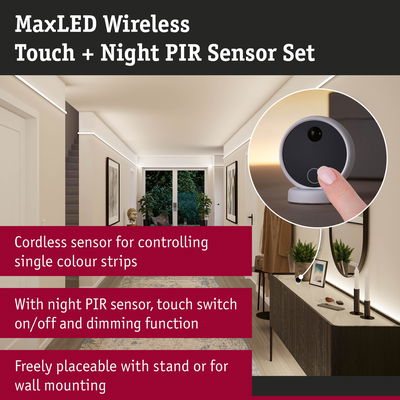 The high-quality Wireless PIR & Touch Sensor Set including receiver for controlling the MaxLED Strips offers the perfect combination of quality, design and functionality. With the appealing black and white design and the wireless construction, the wireless sensors fit harmoniously into any living concept. Thanks to the adhesive wall mounting bracket, the transmitter can be easily attached to the wall and positioned in the magnetic holder as required. The built-in dimmer provides the right lighting mood, while the motion sensor including dusk sensor ensures maximum convenience and safety. The wireless sensors also impress with their easy pairing using the separate "pairing button". Up to 10 transmitters can be linked to each receiver for individual lighting control. Thanks to the efficient technology, a 100% battery charge lasts a whole year, while the service life is 5000 triggers.