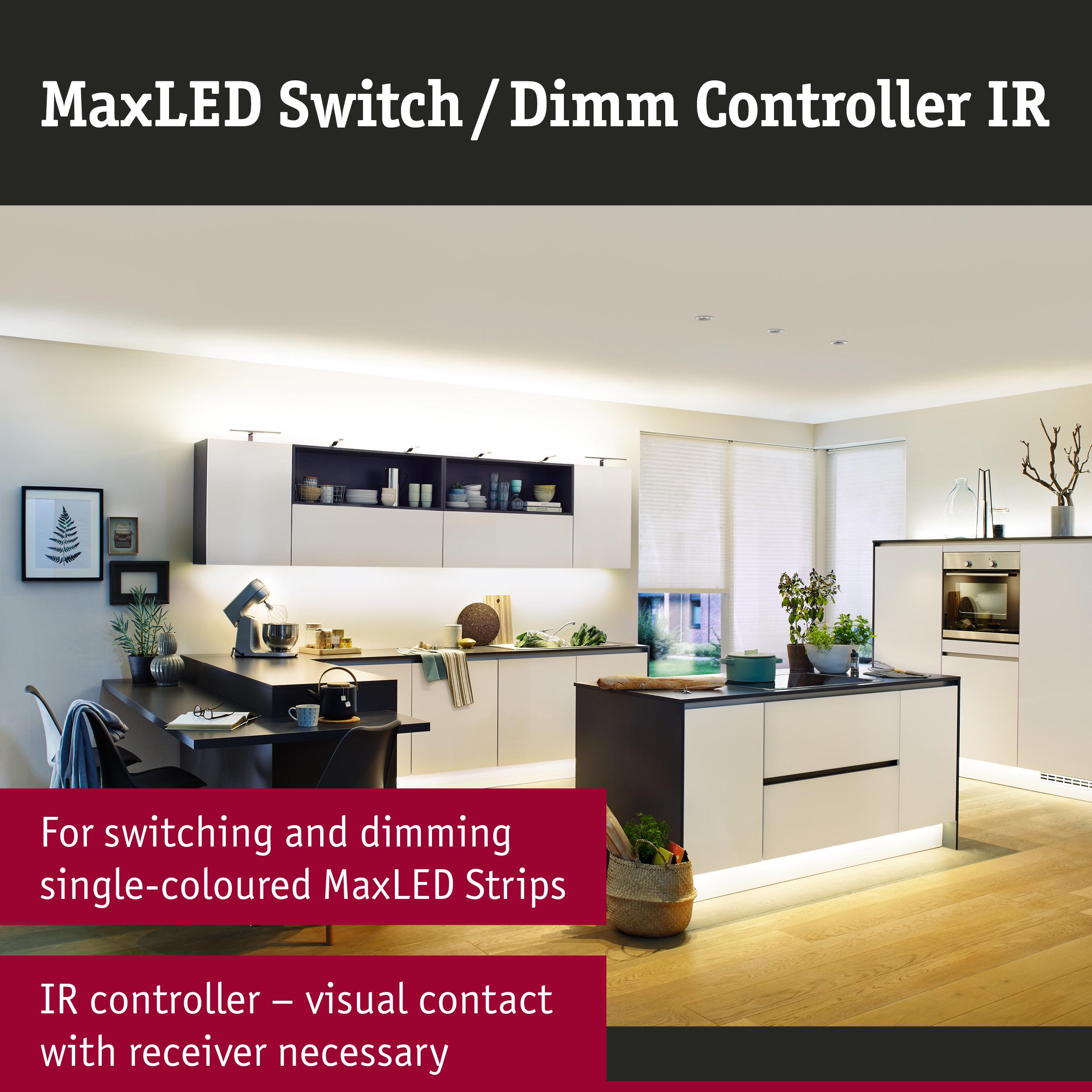 With the MaxLED Dim/Switch Controller and the supplied infra-red remote control, the uni-coloured MaxLED strips can be switched and dimmed. A line of sight is required between remote control and receiver for this purpose. The four memory spaces enable the programming of individual requirements.