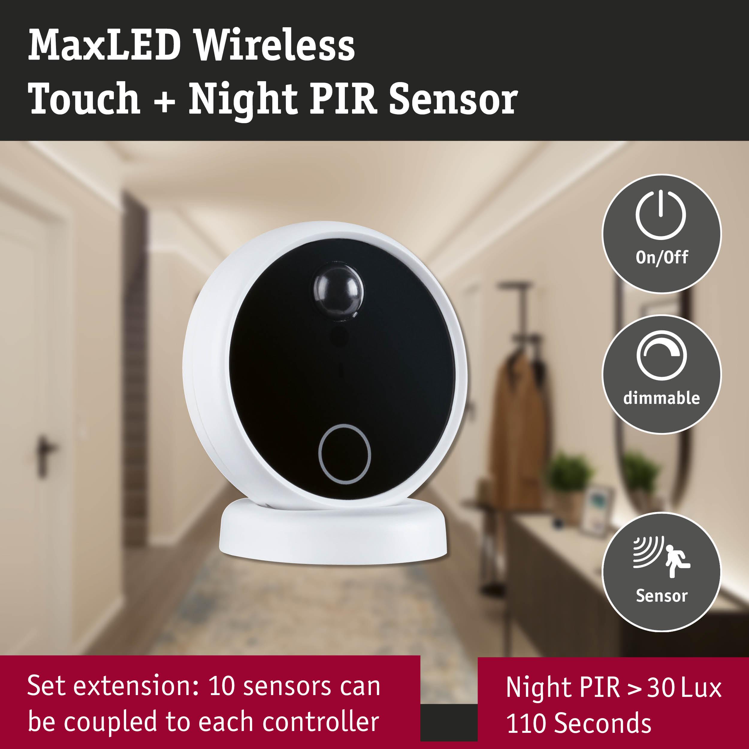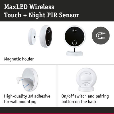 The high-quality wireless sensors for controlling the MaxLED Strips offer the perfect combination of quality, design and functionality. With the appealing black and white design and the wireless construction, the wireless sensors fit harmoniously into any living concept. Thanks to the adhesive wall mounting bracket, the transmitter can be easily attached to the wall and positioned in the magnetic holder as required. The built-in dimmer ensures the right lighting mood, while the motion sensor provides maximum convenience and safety. Incl. dusk sensor, only switches on at dusk. The wireless sensors also impress with their easy pairing using the separate "pairing button". Thanks to the efficient technology, a 100% battery charge lasts a whole year, while the service life is 5000 triggers.