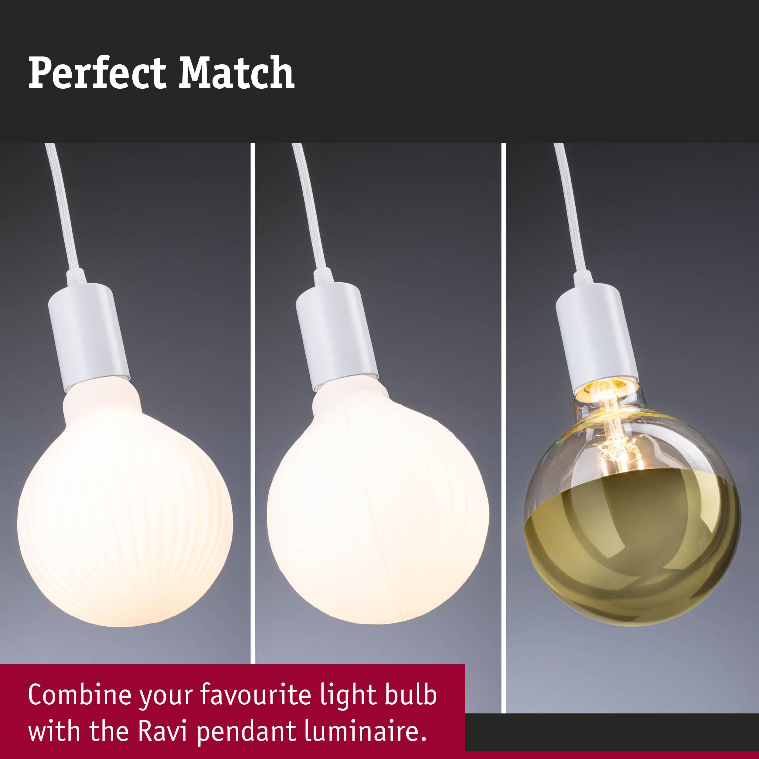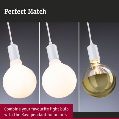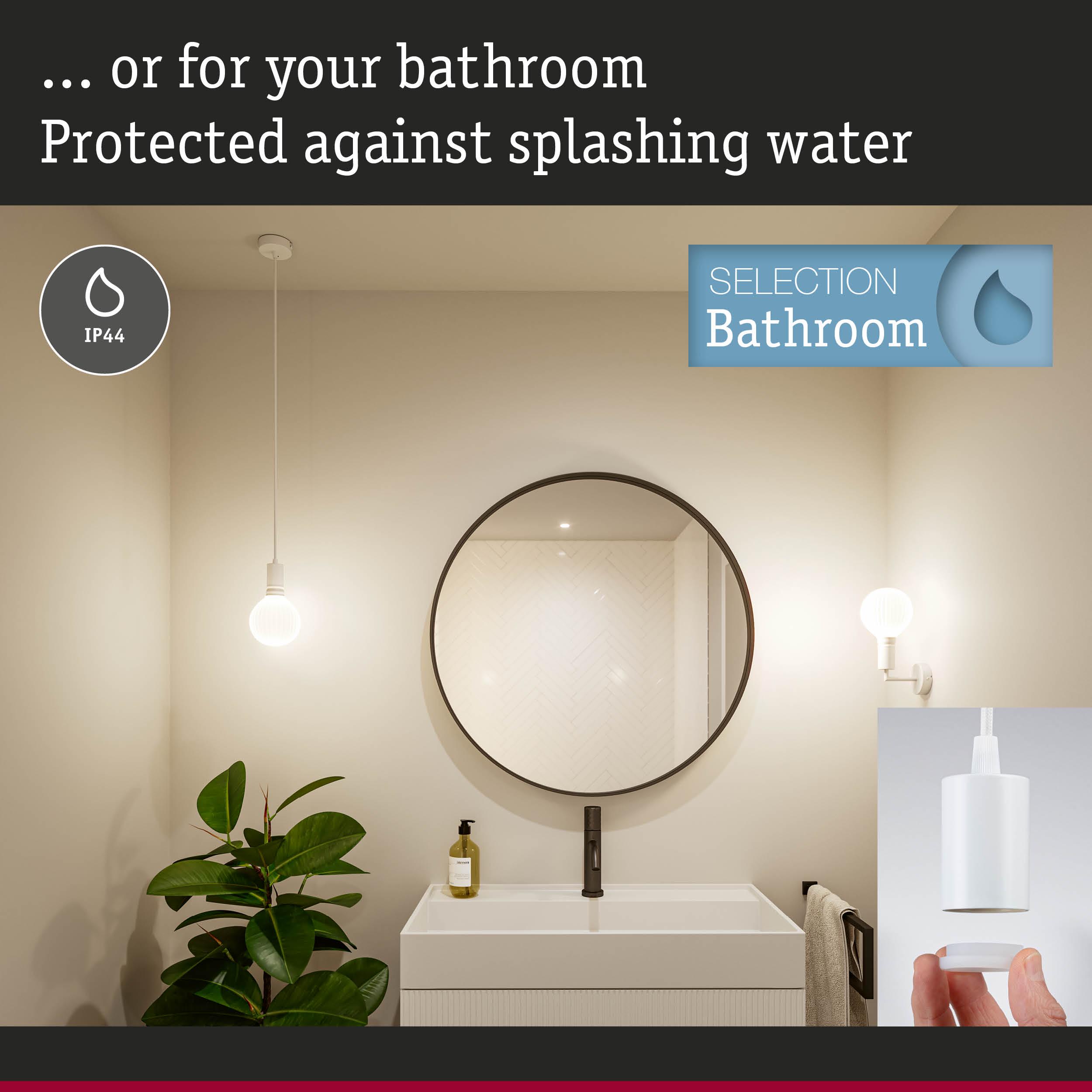 The Mix & Match look is absolutely on trend: add embellishment to your home with a unique and eye-catching piece. The modern Ravi pendant luminaire in Matt white is the perfect proof of this. With its minimalist, modern design and attractive colour combination, it is sure to be a design highlight in any home. Create a perfect set by combining with the decorative lamps from Paulmann. The luminaire harmonises perfectly with lamps from the White Lampion or Metallic Glow series. Alternatively, lamps with an E27 base up to max. 60 watts can be used. Thanks to the IP44 protection, the Ravi wall luminaire can even be used in the bathroom.