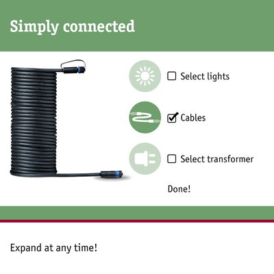 The Plug&Shine connecting cable bridges distances of up to ten metres and enables the connection of an extra luminaire or an additional cable. Combined with luminaires and transformers in the Plug&Shine series, they illuminate your outdoor spaces according to your personal preferences: from house walls or patios, through to garden paths and plants.