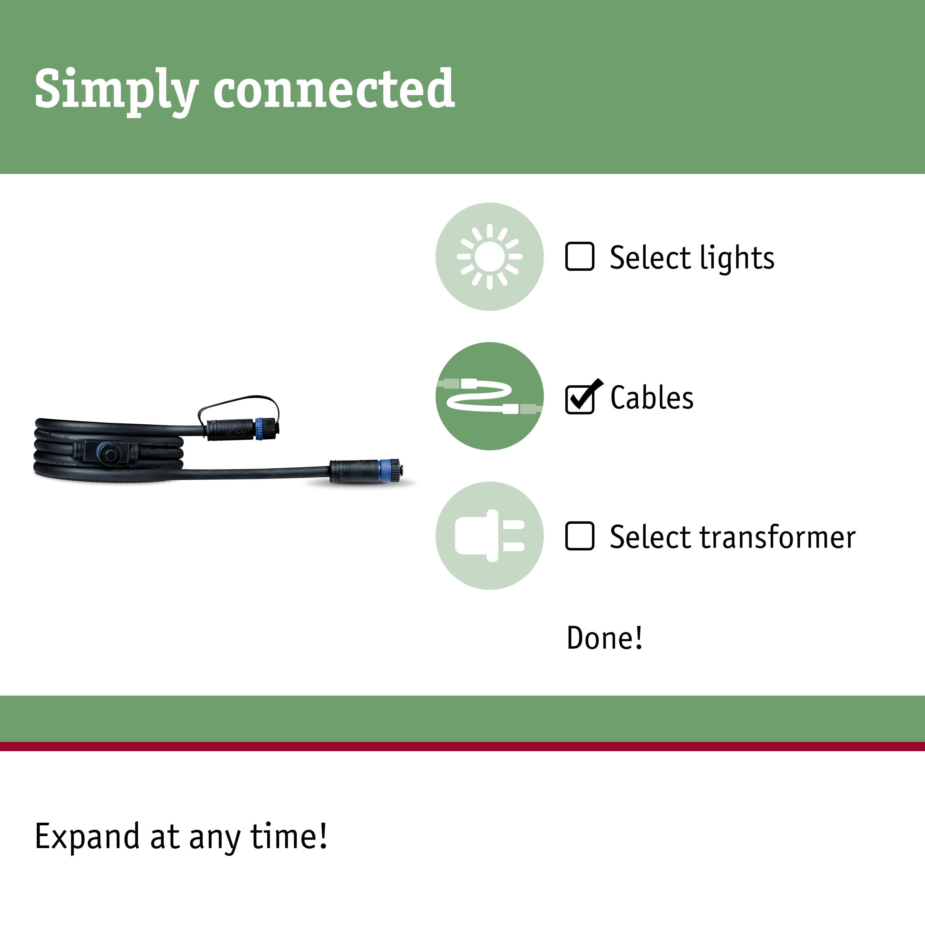 The Plug & Shine connecting cable bridges distances of up to two metres and enables the connection of two extra luminaires or additional accessories. Unused connection ports can be sealed with the cover caps provided to guarantee the IP68 immersion protection. Combined with luminaires and transformers in the Plug & Shine series, they illuminate your outdoor spaces according to your personal preferences: from house walls or patios, through to garden paths and plants.