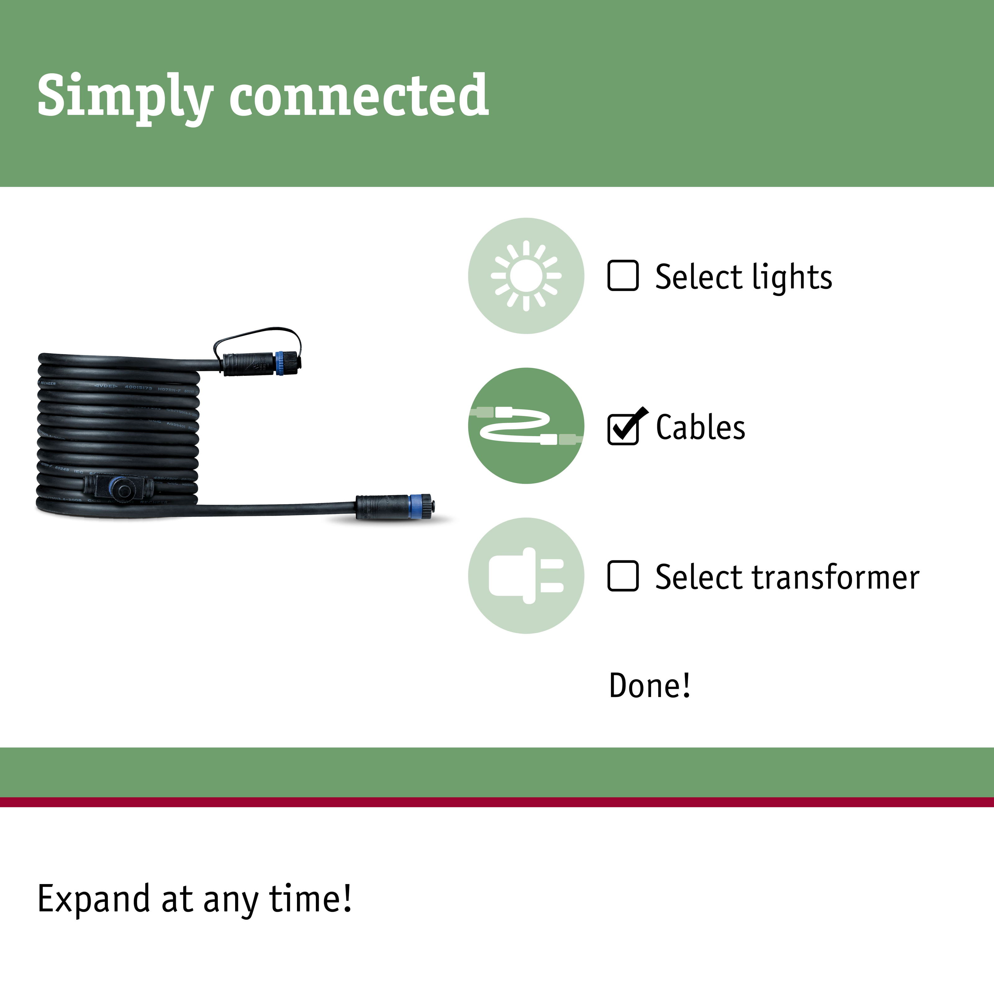 The Plug & Shine connecting cable bridges distances of up to five metres and enables the connection of two extra luminaires or additional accessories. Unused connection ports can be sealed with the cover caps provided to guarantee the IP68 immersion protection. Combined with luminaires and transformers in the Plug & Shine series, they illuminate your outdoor spaces according to your personal preferences: from house walls or patios, through to garden paths and plants.