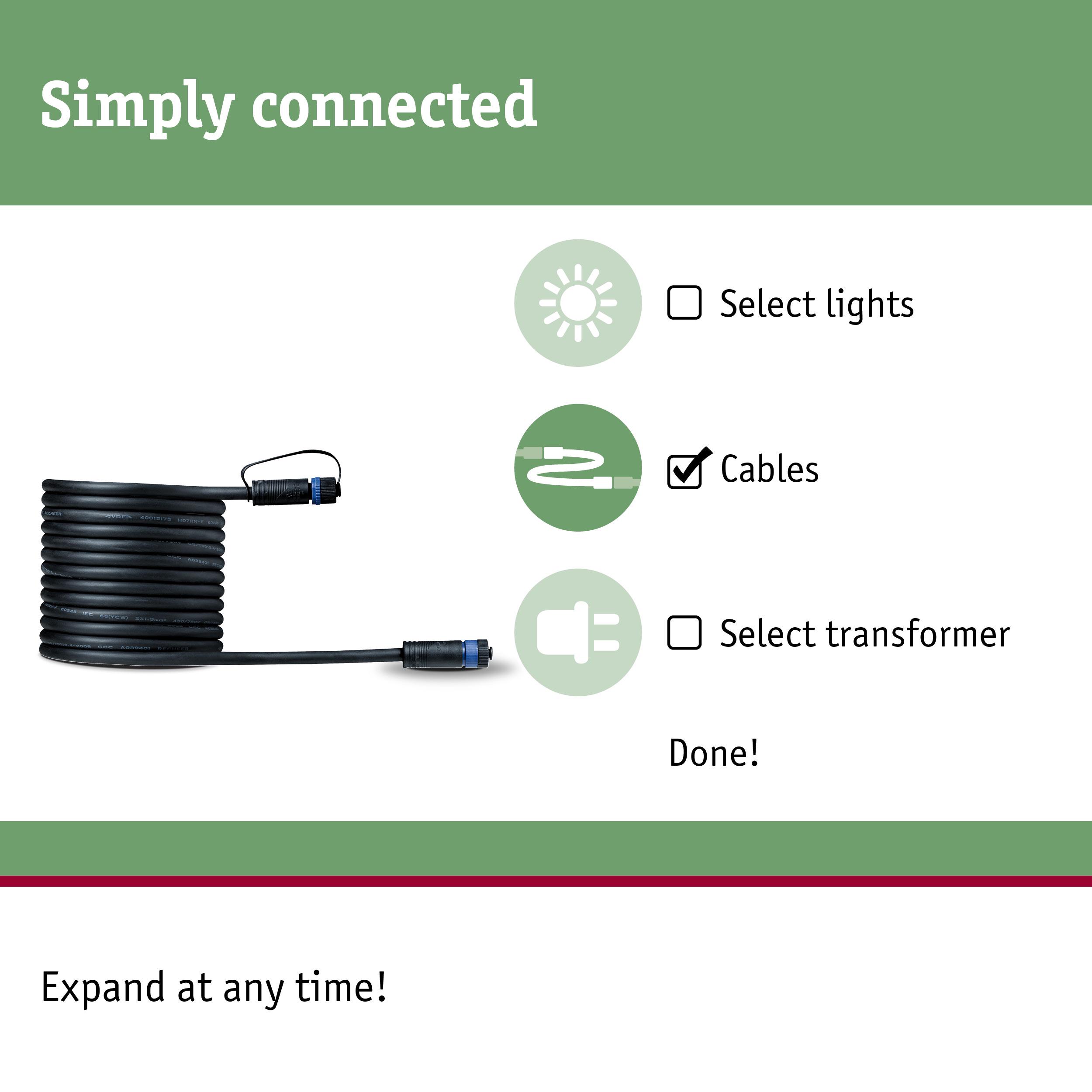 The Plug&Shine connecting cable bridges distances of up to five metres and enables the connection of an extra luminaire or an additional cable. Combined with luminaires and transformers in the Plug&Shine series, they illuminate your outdoor spaces according to your personal preferences: from house walls or patios, through to garden paths and plants.