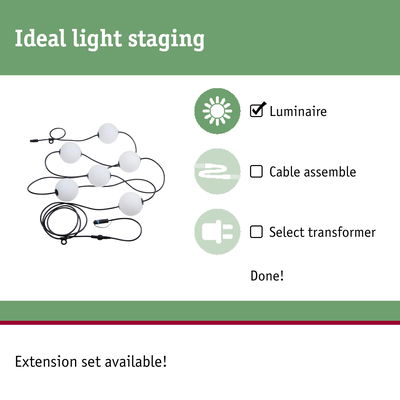 The Naima Plug & Shine fairy lights are the perfect accessory for atmospheric moments outdoors. On trees, patios or railings, they make an eye-catching feature, providing decorative light accents. The basic set is 5.8m long and consists of 6 ball luminaires that emit a warm white, cosy light with a colour temperature of 3000K. With the matching expansion set, the fairy lights can be extended to up to 100 ball luminaires as required, offering flexible design options. The lamps for the ball luminaires are available separately and can be replaced as required. This not only saves costs, but also ensures sustainable and long-lasting usage. Suspension brackets are already integrated into the cable for easy application. Thanks to the high IP67 protection, the fairy lights are particularly robust and durable. In combination with transformers, connectors and other luminaires from the Plug & Shine series, you’ll have a custom outdoor light installation ready in no time at all.