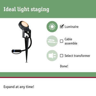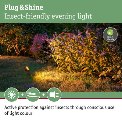 Unpack, assemble and light up the garden: With a light colour of 2,200 K, the Plug & Shine Sting LED Spot is particularly insect-friendly because this value is outside the visible range for most insects, so they are not attracted to the additional light source. The luminaire actively protects insects without neglecting the benefits for humans. The warm gold light creates a pleasant atmosphere around the house. The spike is ideal for illuminating plants and other objects, can be individually positioned and is completely weatherproof. The system can be expanded with additional Plug & Shine components, if required.