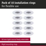 The rigid recessed luminaire rings in a 10-piece set in White plastic are a perfect solution for flexible illumination. The unobtrusive snap ring complements the luminaire perfectly for a seamless look. Suitable for 50 mm diameter lamps, e.g. GU10 or Paulmann LED coins
