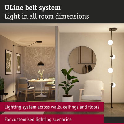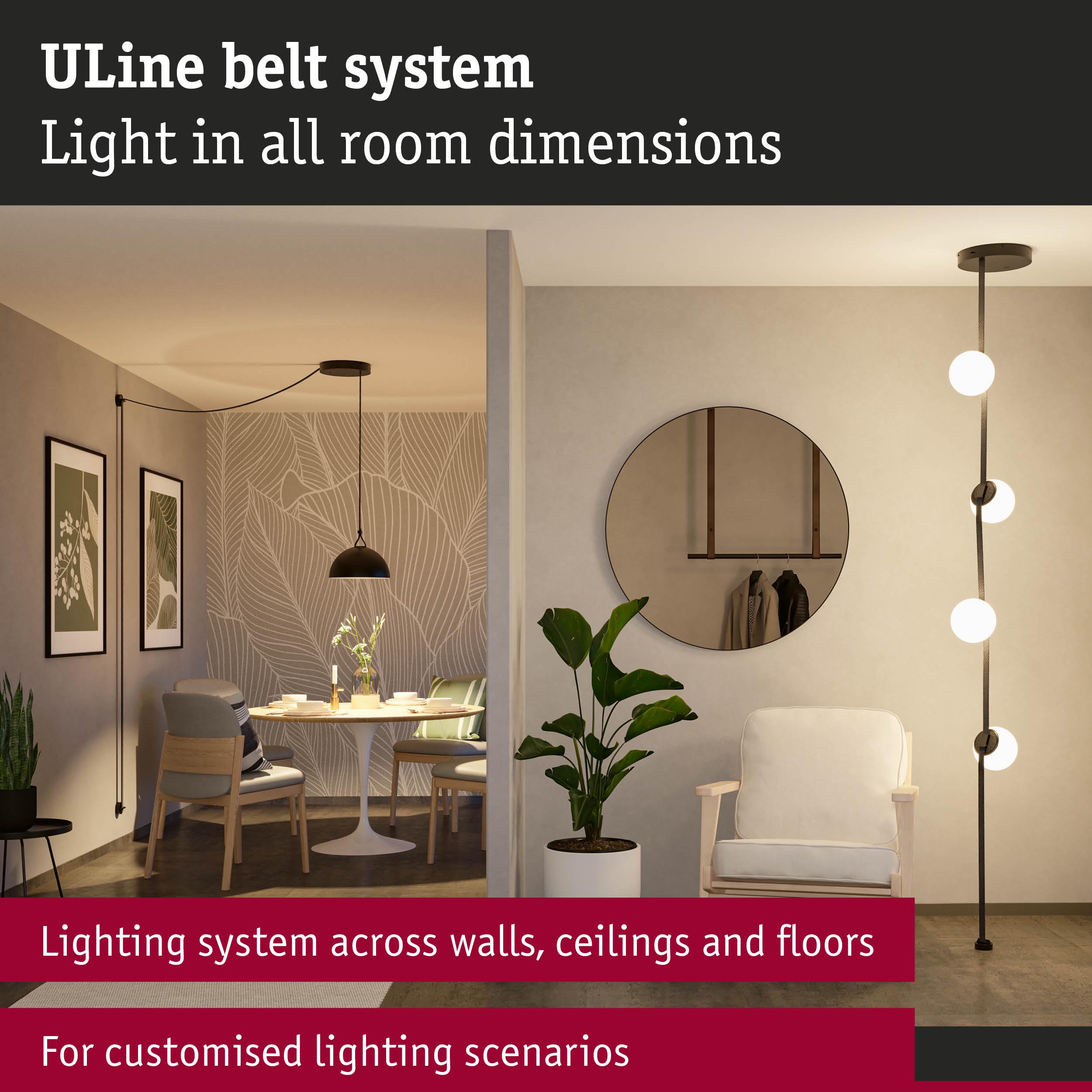 The 150 VA installation set of the ULine system provides the perfect basis for a customized lighting installation. This comprehensive set contains everything you need to get started: Clamps, the Straight bracket, cover caps, power supply, a transformer cover and a powerful transformer. Belt, luminaires and additional luminaires can be added individually as required, ensuring maximum flexibility and creative freedom. The ULine Belt system is an innovative solution for unique lighting experiences in all room dimensions and enables targeted lighting effects on walls, Decks and floors.