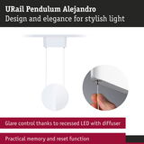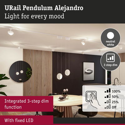 The Alejandro URail Pendant in Signal white is a feature piece for ceilings and enhances any room with its stylish design. The 3-step dimming function enables simple lighting control using an existing wall switch, with no need for an additional wall dimmer. With dimming levels of 100%, 50% and 25%, this pendant offers flexible lighting control that is suitable for any mood and every situation. The 4000 Kelvin ensures a pleasant neutral white light that provides optimal illumination for the room. The recessed LED chip with diffuser creates glare-free light with uniform distribution, for a pleasant atmosphere. The memory and reset function is so practical: you can save the last-used brightness setting or reset the settings as required. The design of the pendant adds a charming elegance to any room and creates stylish accents.