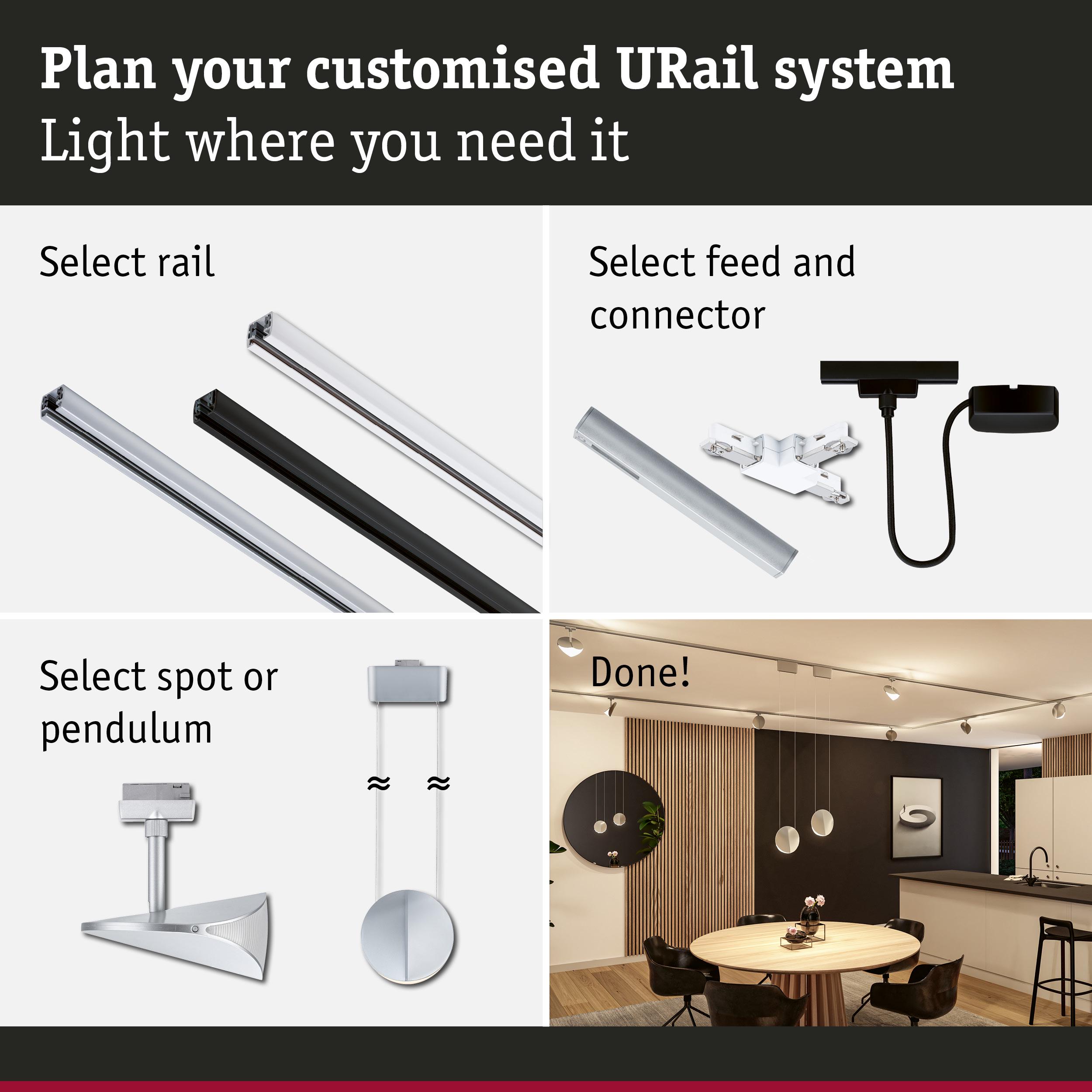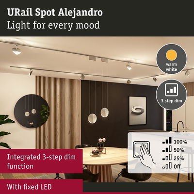 The Alejandro URail Spot in Chrome matt is a feature piece for walls or ceilings and enhances any room with its stylish design. The 3-step dimming function enables simple lighting control using an existing wall switch, with no need for an additional wall dimmer. With dimming levels of 100%, 50% and 25%, this spot offers flexible lighting control that is suitable for any mood and every situation. The 3000 Kelvin ensures a pleasant warm white light that provides optimal illumination for the room. The recessed LED chip with diffuser creates glare-free light with uniform distribution, for a pleasant atmosphere. The memory and reset function is so practical: you can save the last-used brightness setting or reset the settings as required. The design of the spot adds a charming elegance to any room and creates stylish accents.