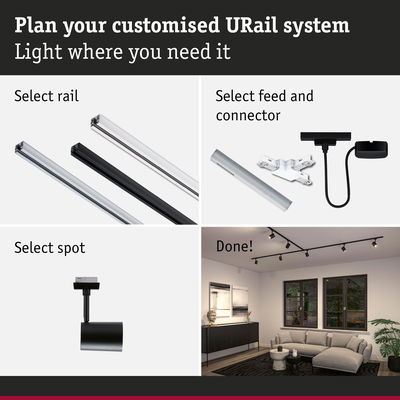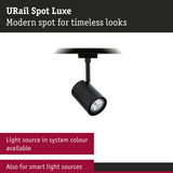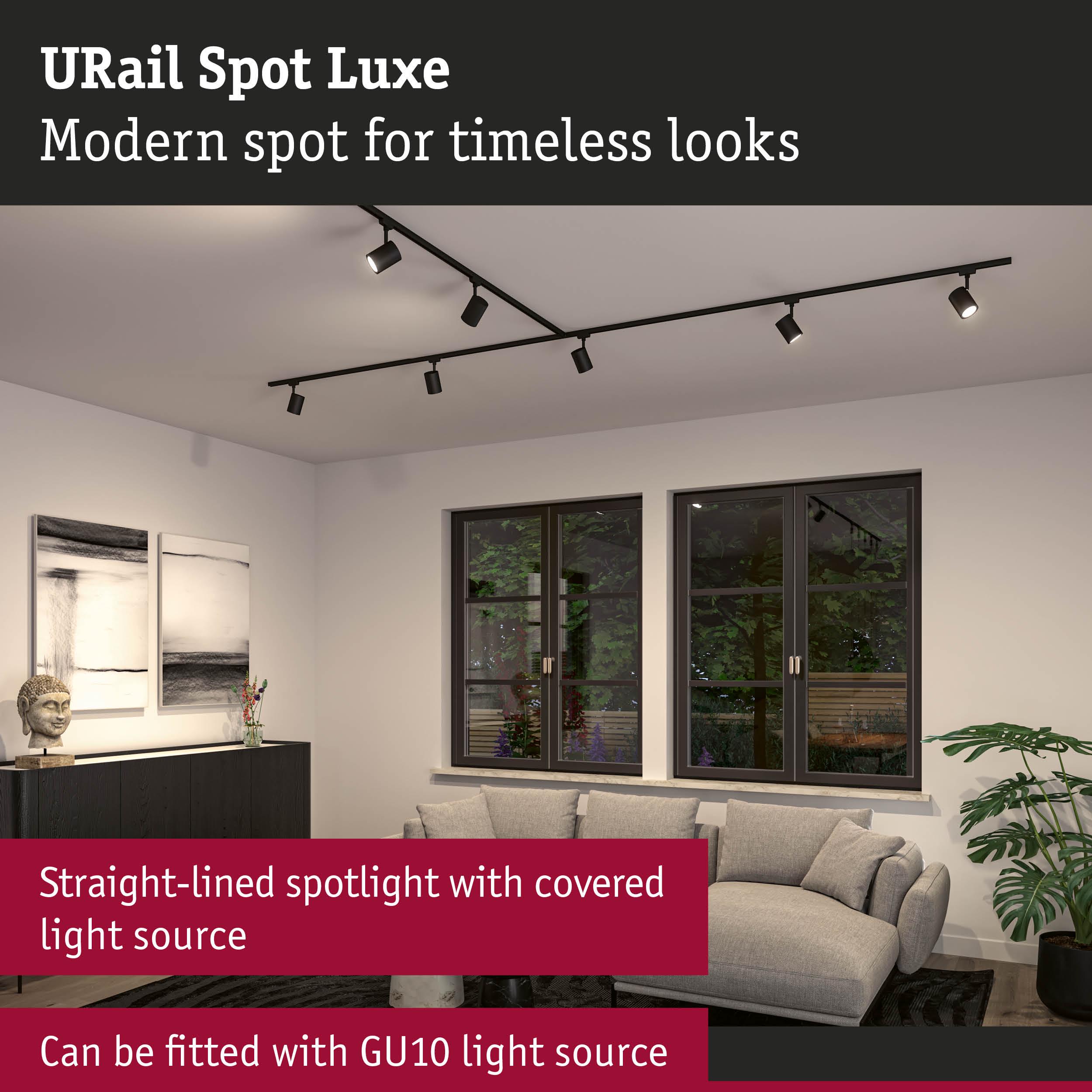 The modern Luxe URail Spot in Black matt is characterised by its linear design. The spot has a covered GU10 fitting, so the user can choose any compatible lamp. This gently diffuses the light and creates a pleasant atmosphere. When paired with a smart lamp, the spot can be easily controlled using the app. At the touch of a button, adjust the brightness, select different colour tones or create atmospheric lighting scenarios. The URail Spot Luxe is the ideal choice for any room. Its high-quality construction and timeless design make it an eye-catching feature.