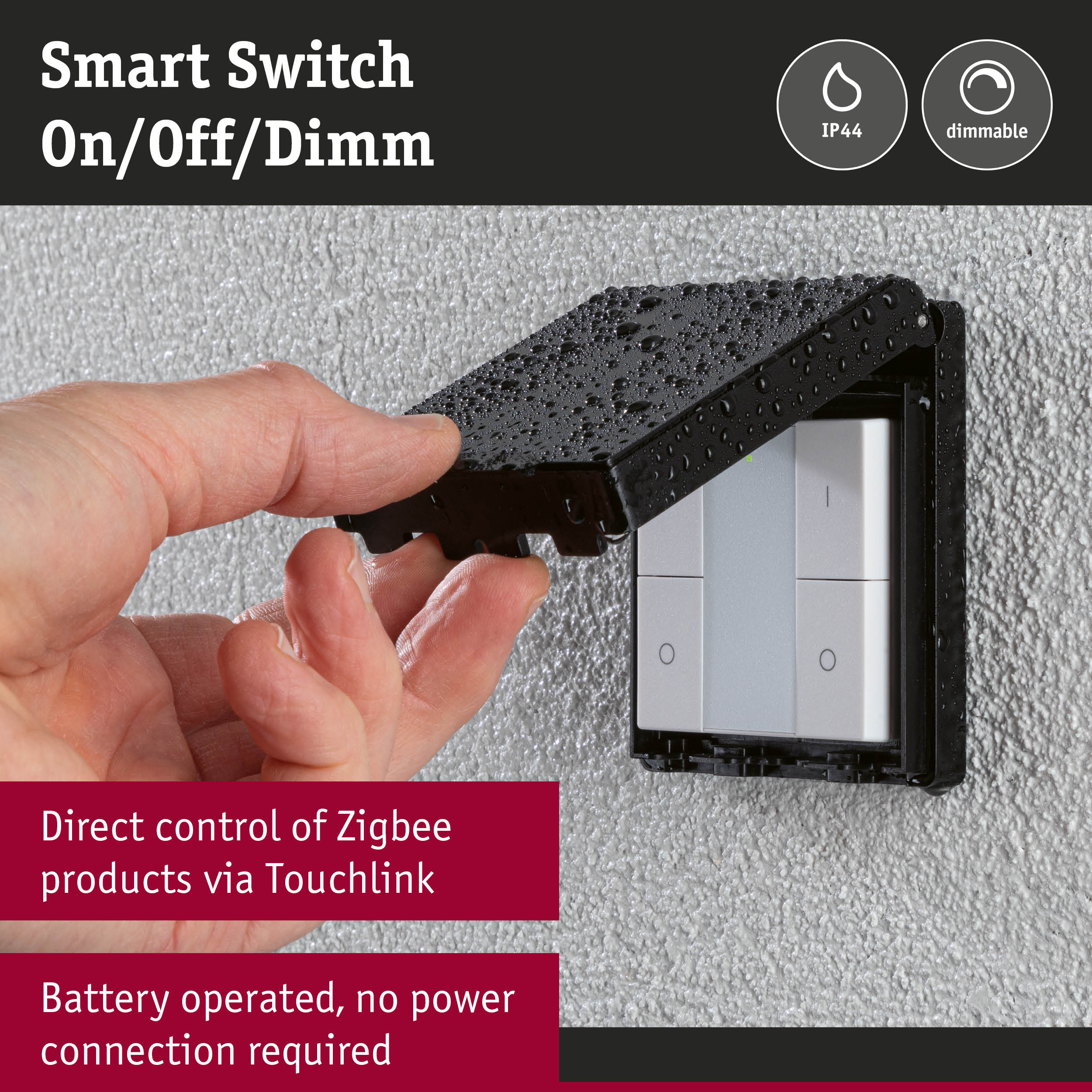 The smart wall switch enables intuitive, direct switching and dimming of smart Zigbee 3.0 products without a smartphone or gateway. When combined with the Paulmann smik gateway, an individual configuration can be set up. Group keys can only be individually assigned with rooms and scenes using the corresponding Paulmann smik app. Using the wall switch with another Zigbee 3.0 gateway may be possible depending on the manufacturer, but is not guaranteed by Paulmann. In this case, basic control of Zigbee 3.0 luminaires via Touchlink is possible after integration. Thanks to IP44 protection, the smart wall switch is splash-protected and can therefore be used outdoors.